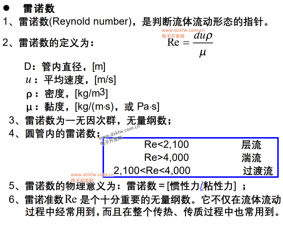 層流和湍流的雷諾數(shù)是判斷流體流動狀態(tài)的關(guān)鍵參數(shù)。雷諾數(shù)(Reynolds number)是一個無量綱數(shù),用來表征流體流動情況。其計算公式為Re = ρvd/μ,其中v、ρ、μ分別為流體的流速、密度與黏性系數(shù),d為一特征長度,例如流體流過圓形管道時,d為管道的當量直徑。