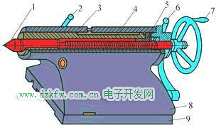 1頂尖 2套筒鎖緊手柄 3頂尖套筒 4絲桿 5螺母 6尾座鎖緊手柄 7手輪 8尾座體 9底座
