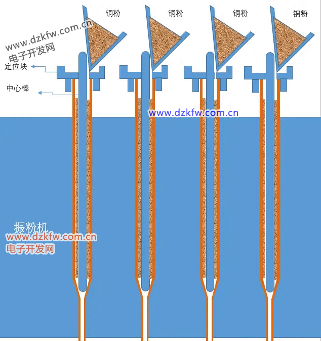 4>填粉-在銅管的中心插入一根不銹鋼芯棒,并通過模具定位在銅管的正中間,然后填入指定粒度的銅粉(通過振動設備使銅粉達到一定的密度,以以控制燒結后毛細結構的孔隙率)