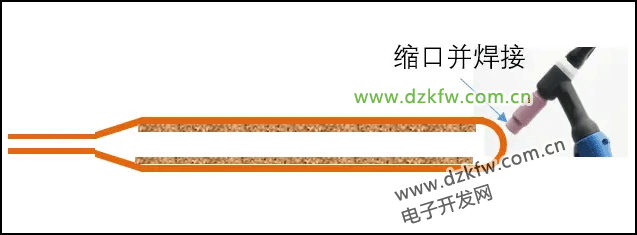 6>縮軟管、焊接-縮尾端,也就是填銅粉的那一端,縮口并焊接使其密封