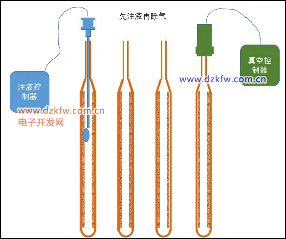 7>注液/一次除氣:通過注液泵等定量注水控制設備往熱管內部注入一定量的超純水,并立即通過真空設備除去管體內部的空氣,密封管口。