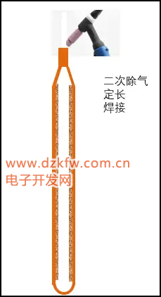 8>二次除氣/定長:由于第一次真空除氣可能不充分,這里再進行一次加熱除氣,第二次封口,并切出準確的長度尺寸,切完后用氬弧焊將切口焊接使其密封。