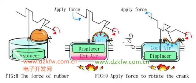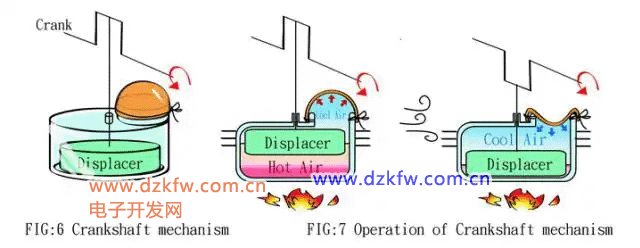 氣體在熱置換氣缸內,受移氣器的推動,在冷端和熱端來回流動,空氣流動到熱端時,受熱膨脹,推動動力活塞向外運動。空氣流動到冷端時,受冷收縮,吸引動力活塞向內運動。動力活塞就向外輸出了動力,帶動曲軸轉動。