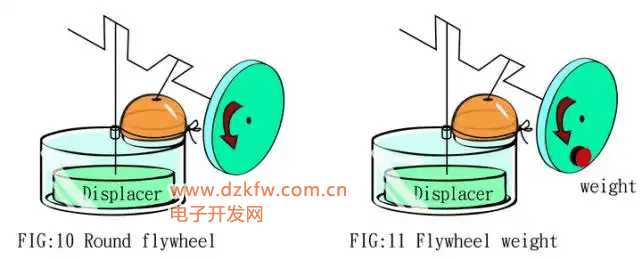 為了能讓曲軸轉過死點,加上飛輪,飛輪上加上配重,配重加在移氣體曲柄相對的位置,克服移氣體的重力,使運轉更平穩。