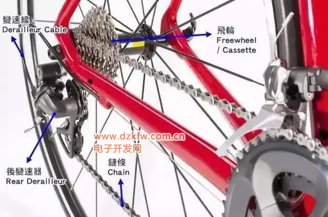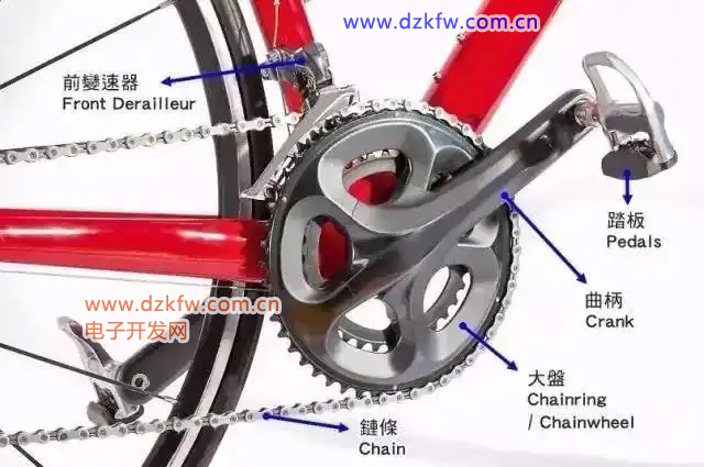 組成部分:踏板,曲柄,大盤,五通/中軸(簡稱BB),鏈條,飛輪 ,前變速器,后變速器 ,變速線