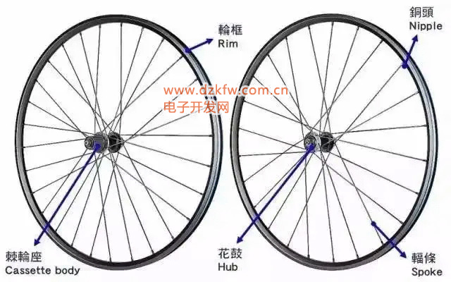 組成部分:輪框,花鼓(騎車炸街的就是它),輻條 ,銅頭,棘輪座,快拆,勾爪,輪胎 ,氣嘴