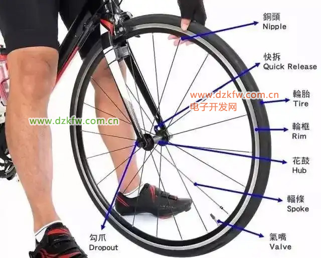 輪組:自行車依靠輪胎與地面接觸摩擦而前進或停止,因此輪組的材質、設計會影響騎行的速度與穩定性。(一般的自行車都是鋁輪)