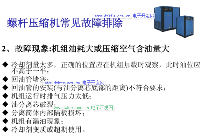 故障2:機(jī)組油耗大或壓縮空氣含油量大 、故障現(xiàn)象 機(jī)組油耗大或壓縮空氣含油量大冷卻劑量太多,正確的位置應(yīng)在機(jī)組加載時(shí)觀察,此時(shí)油位應(yīng) 不高于一半; 回油管堵塞; 回油管的安裝(與油分離芯底部的距離)不符合要求; 機(jī)組運(yùn)行時(shí)排氣壓力太低; 油分離芯破裂; 分離筒體內(nèi)部隔板損壞; 機(jī)組有漏油現(xiàn)象; 冷卻劑變質(zhì)或超期使用。