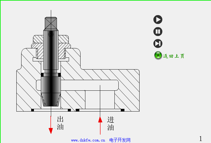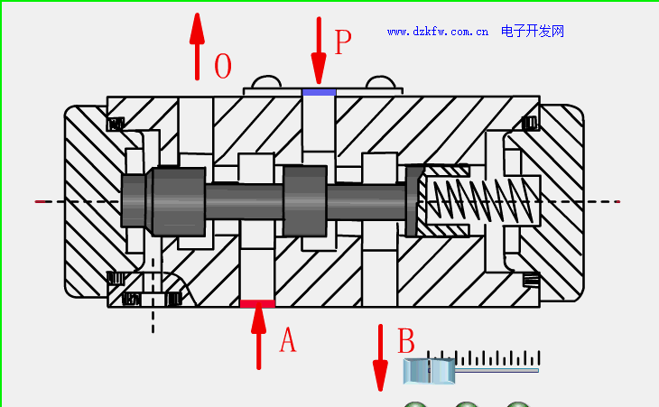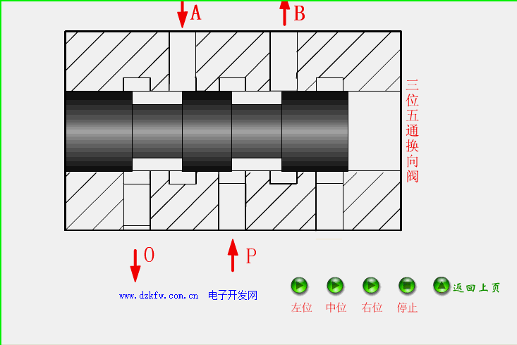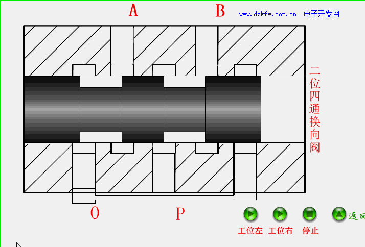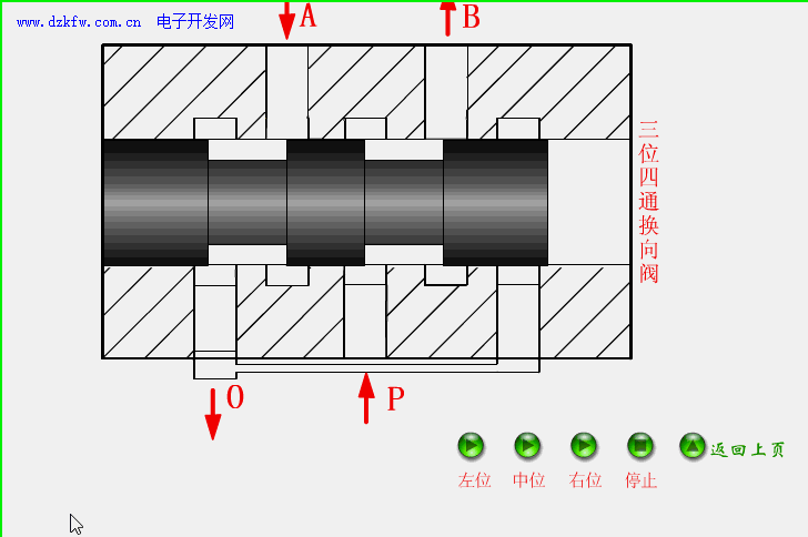 P 為供油口,O 為回油口,A ﹑B 是通向執(zhí)行元件的輸出口。當(dāng)閥芯處於中位時(shí),全部油口切斷,執(zhí)行元件不動(dòng);當(dāng)閥芯移到右位時(shí),P 與A 通,B 與O 通;當(dāng)閥芯移到左位時(shí),P 與B 通,A 與O 通。這樣,執(zhí)行元件就能作正﹑反向運(yùn)動(dòng)。
