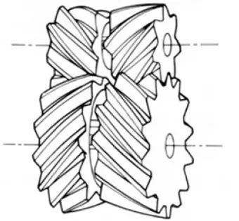 齒線為左旋及右旋的兩個斜齒齒輪組合而成的齒輪。有在軸向不產生推力的優點。