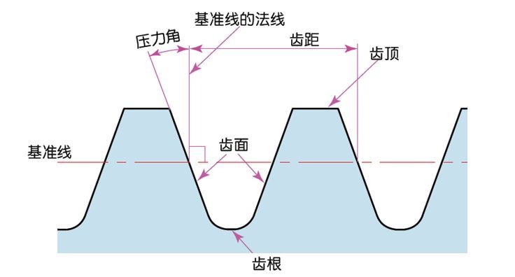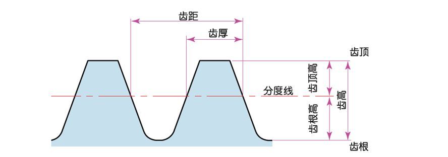 模數乘以圓周率即可得到齒距(p),齒距是相鄰兩齒間的長度。
