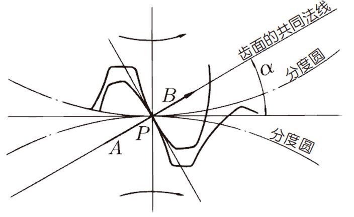 A齒在節點上推動B點。這個時候的推動力作用在A齒及B齒的共同法線上。也就是說,共同法線是力的作用方向,亦是承受壓力的方向,α則為壓力角。