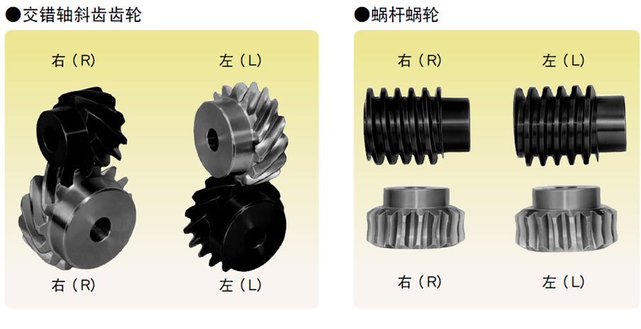 斜齒齒輪、弧齒傘形齒輪等,輪齒呈螺旋狀的齒輪,螺旋方向和配合是一定的。螺旋方向是指當齒輪的中心軸指向上下,從正面看上去時,輪齒的方向指向右上的是[右旋],左上的是[左旋]。各種齒輪的配合如下所示。