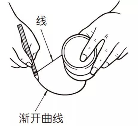 將一端系有鉛筆的線纏在圓筒的外周上,然后在線繃緊的狀態下將線漸漸放開。此時,鉛筆所畫出的曲線即為漸開曲線。圓筒的外周被稱為基圓。