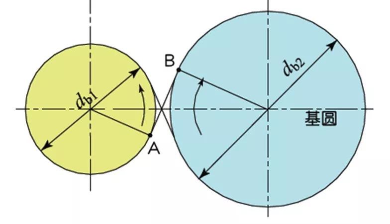 基圓的公切線A一B被稱為嚙合線。齒輪的嚙合點都在這條嚙合線上。