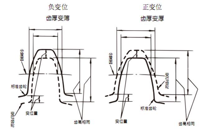 變位有正變位和負變位。雖然齒高相同,但齒厚不同。齒厚變厚的為正變位齒輪,齒厚變薄的為負變位齒輪。