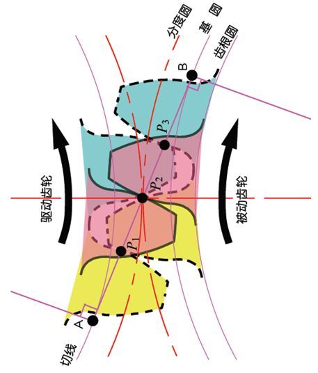 兩個齒輪齒形的嚙合接觸點按P1—P2—P3的順序在嚙合線上移動。請注意驅動齒輪中黃色的輪齒。這個齒開始嚙合后的一段時間內,齒輪為兩齒嚙合(P1、P3)。嚙合繼續,當嚙合點移動到分度圓上的點P2時,嚙合輪齒只剩下了一個。嚙合繼續進行,嚙合點移動到點P3時,下一個輪齒開始在P1點嚙合,再次形成兩齒嚙合的狀態。就像這樣,齒輪的兩齒嚙合與單齒嚙合交互重復傳遞旋轉運動。