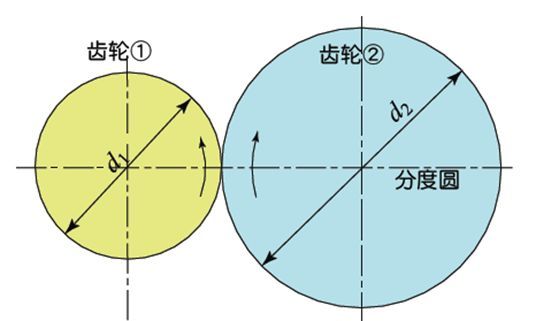 兩輪嚙合時的模樣,看上去就像是分度圓直徑大小為d1、d2兩個摩擦輪(Friction wheels)在傳動。但是,實際上漸開線齒輪的嚙合取決于基圓而不是分度圓。