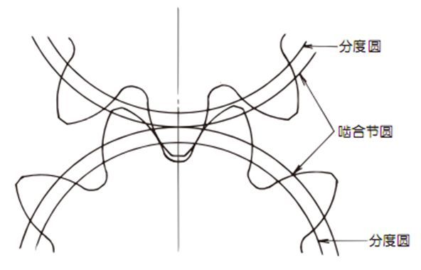 標準齒輪是在各個齒輪的分度圓相切狀態下嚙合。而經過變位的齒輪的嚙合,如圖所示,是在嚙合節圓上相切嚙合。嚙合節圓上的壓力角稱為嚙合角。嚙合角與分度圓上的壓力角(分度圓壓力角)不同。嚙合角是設計變位齒輪時的重要要素。