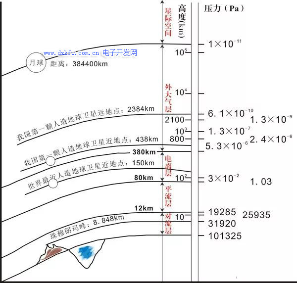我們可以直觀的看出,最高峰珠穆朗瑪峰海拔8.848千米,峰頂?shù)拇髿鈮毫χ挥?1920Pa,為標準大氣壓的三分之一左右;而到了平流層與電離層的臨界處,大氣壓力僅1.03Pa左右;在我國的第一顆人造地球衛(wèi)星(近地點438km,遠地點2384km)運行處,大氣壓力達到了5.3×10-6 Pa~6.1×10-10Pa之間。