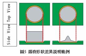 圖5是該問題的模式說明范例,若從側(cè)面觀察圖示兩種錫膏形狀,可以發(fā)現(xiàn)兩者的錫膏印刷量截然不同,然而從上方觀察時(shí)卻無法區(qū)隔兩者的差異,換句話說傳統(tǒng)二次元檢查設(shè)備針對這兩種錫膏印刷量,可能會判定成完全相同形狀,因此研究人員分別使用二次元與三次元檢查設(shè)備進(jìn)行錫膏印刷量量測,證實(shí)二次元檢查設(shè)備無法獲得的數(shù)據(jù)超過預(yù)期,最后決定改用三次元檢查設(shè)備。