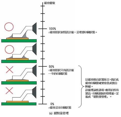 絕對量的管理是調(diào)查錫膏印刷量與接合可靠性的相互關(guān)系,以及可靠性不會發(fā)生問題,而且可以實(shí)現(xiàn)焊錫接合的錫膏量。
