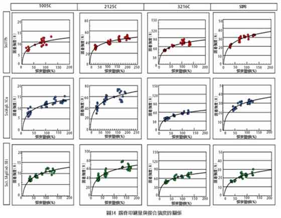 圖14是錫膏印刷量與接合強(qiáng)度的量測結(jié)果范例,由圖可知不論哪種錫膏與哪種組件組合,一直到錫膏印刷量50%為止,接合強(qiáng)度會急遽上升,接著隨著錫膏印刷量的增加,接合強(qiáng)度呈現(xiàn)緩和上升。