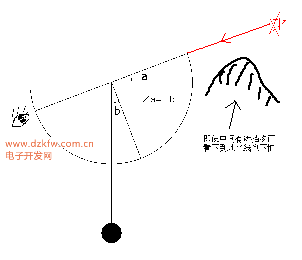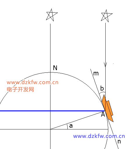 - 然后,從A點畫一條地軸的平行線,它與地平線形成夾角∠b,經(jīng)過簡單的幾何推算可得,∠a=∠b