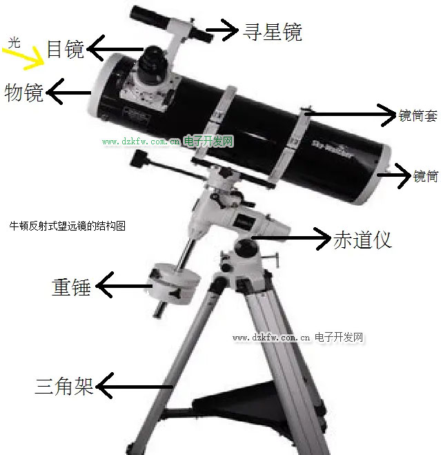 7、反射望遠鏡在天文望遠鏡中應用十分廣泛,由于這種系統對玻璃材料在光學性能上沒有特殊要求,光線不需透過材料本身,而且重量較輕無色差。有些時候用這種望遠鏡觀測月亮和行星也是很適合的。如果要進行拍照,使用牛頓式望遠鏡時非常好的。