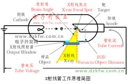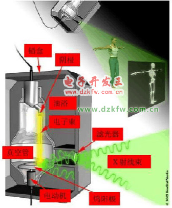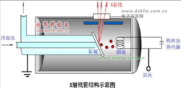 一個陰極一個陽極的真空二極管,在高壓下產生電子的發射,陽極端的金屬板受到電子的擊打,產生X射線。通過束光器等等的作用,產生幾乎平行的X射線。