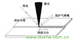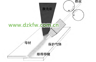 激光釬焊將激光作為熱源,填充金屬選擇熔點比焊接材料低的材料,利用加熱熔化后的釬料潤濕母材,填充接頭間縫隙并與母材相互擴散,實現有效焊接的目的,其工作原理如圖 3.1 所示。激光釬焊技術焊接,不但可以保證產品外觀的美觀性,還可以保證產品密封性能,保證焊接區域強度,保證產品的使用與安全性能。
