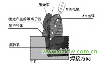 激光與 MIG 電弧復合焊接技術就是激光復合焊。該工藝通過激光和電弧的相互作用,互相補充。激光復合焊技術比單純的激光焊技術更加經濟,焊接速度較快、焊接過程相對穩定,熱效率高允許較大焊接裝配間隙,其技術原理如圖3.4所示。