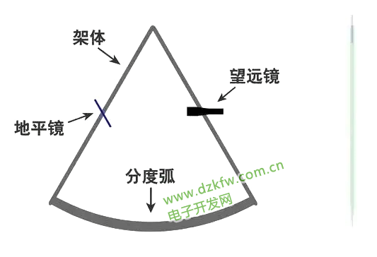 包括兩大部分。第一部分,包括架體、分度弧、望遠鏡、半透明半反射的地平鏡,都是固定住的。