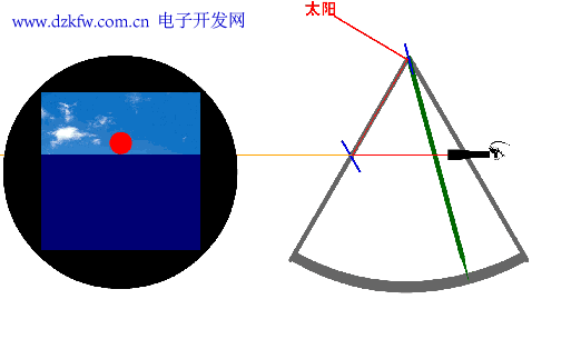 觀測者通過望遠鏡和地平鏡,注視著遠方的海平線。上中天的太陽,其光線射向了指標鏡。