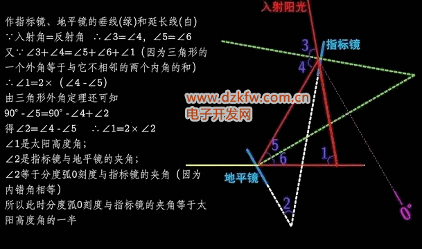指標臂角度歸零的時候,地平鏡、指標鏡和0刻度線,這三者是平行的。所以∠2,其實也等于指標鏡與0刻度線的夾角。