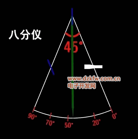 而更早之前,人們用過八分儀。顧名思義,八分儀的分度弧是45度,是一周360度的八分之一,測量范圍是90度。六分儀出現(xiàn)后,八分儀就被淘汰了。