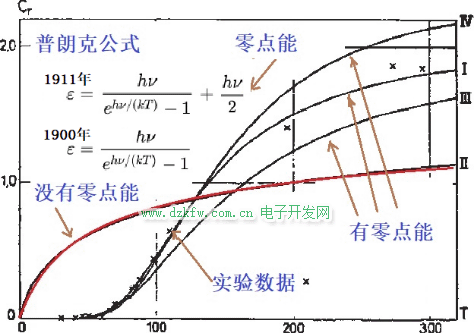 根據普朗克新表述的輻射公式,量子系統所擁有的能量不能低于零點能。普朗克當時并不很在意這個(1/2) hν,但卻很快地引起了正在研究統計中漲落公式的愛因斯坦(Albert Einstein,1879 -1955)的注意。愛因斯坦說:“零點能可能真的存在!”,并和他的助手奧托·施特恩(Otto Stern,1888-1969)一起寫了一篇文章:假設雙原子分子的旋轉能含有零點能,并且所有雙原子分子以同樣角速度旋轉,然后計算出雙原子分子氣體的比熱。將氫氣的理論比熱與實驗數據相互比較(圖22-2的曲線),用零點能的概念解釋了氫低溫比熱的實驗結果,證明了零點能存在的必要性[2]。后因為保羅·埃倫費斯特(Paul Ehrenfest,1880 -1933)給出更具一般性的計算,據說他們又撤回了那篇論文。