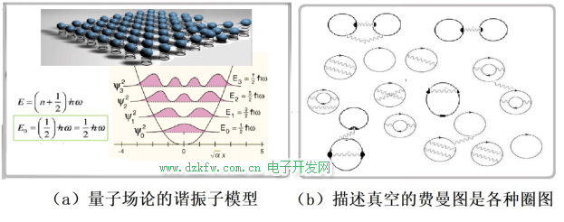 在量子場論中,每個時空點都被看作是量子化的簡諧振子,并與相鄰振子有相互作用,見圖22-3a。每個諧振子的真空期望值為(1/2) hν(圖中表示為約化普朗克常數和角頻率的乘積)。因為諧振子可取的頻率值為無窮多,從而導致無限大的零點真空能量。