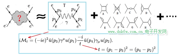 總結一下上面的解釋:電子-電子散射時,最主要的相互作用是正比于電子電荷e平方的項,其散射概率可以用電子場和光子場根據圖下面的數學公式表示的函數,對時空變量進行積分計算而得到。
