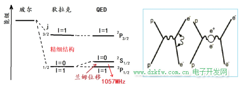 圖22-6左圖,比較了三種理論框架下的部分氫原子光譜:玻爾模型中的一個簡并能級在狄拉克相對論理論下分裂成精細結構。然后,更為精細的蘭姆位移可以用QED理論解釋。氫原子基態能級是13.6ev,精細結構只有基態數量級的十萬分之一,蘭姆位移又只有精細結構的十分之一。