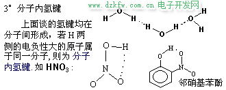 H2O 和 HF 的分子間氫鍵很強, 以致于分子發生締合, 以(H2O)2、 (H2O)3、(HF)2、(HF)3 形式存在, 而 (H2O)2 排列最緊密, 4℃時, (H2O)2 比例最大, 故 4℃ 時水的密度最大. 可以形成分子內氫鍵時, 勢必削弱分子間氫鍵的形成. 故有分子內氫鍵的化合物的沸點、熔點不是很高.典型的例子是對硝基苯酚和鄰硝基苯酚: