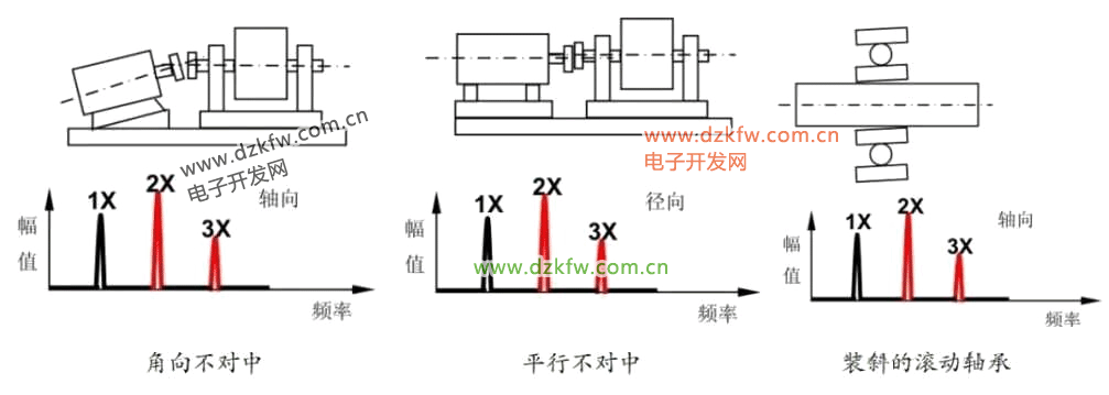平行不對中癥狀特征:①大的徑向方向相位差180°的振動嚴重不對中時,產生高次諧波頻率;②2X轉速幅值往往大于1X轉速幅值,類似于角向不對中的癥狀;③聯軸器的設計可能影響振動頻譜形狀和幅值。