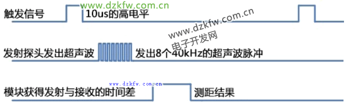2、觸發后,模塊會自動發送8個40KHz的超聲波脈沖,并自動檢測是否有信號返回。