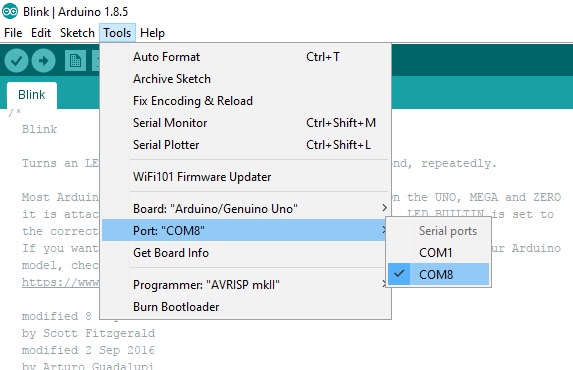 最后一步是將程序加載到Arduino中。第一項任務是確保IDE知道要使用哪個串口,因此,為此,我們導航到工具》端口,然后選擇串口。值得慶幸的是,大多數現代設備沒有串行端口,因此應該有兩種選擇之一:COM1和其他一些COM。 COM1通常不是可訪問的串行端口,并且由OS內部使用,因此請選擇備用COM端口。例如,我的是COM8。被警告!計算機可能決定在將來更改COM端口,因此如果IDE在連接時找不到Arduino,請轉到端口列表并查找備用端口。例如,我的Arduino曾經是COM7,但由于某種原因改為COM8。