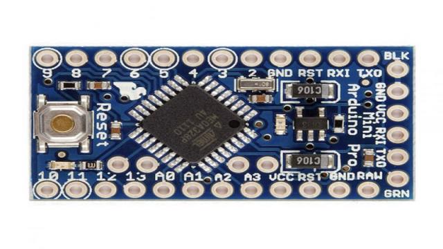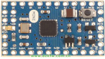 Arduino Pro Mini采用ATmega328作為核心處理器,配備14路數字輸入/輸出引腳(其中6路用于PWM輸出)、8路模擬輸入、一個板上諧振器、一個復位按鈕和若干用于安裝引腳接頭的小孔。