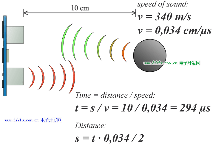 (3)有信號(hào)返回,通過(guò)IO輸出一高電平,高電平持續(xù)的時(shí)間就是超聲波從發(fā)射到返回的時(shí)間.測(cè)試距離=(高電平時(shí)間*聲速(340M/S))/2;