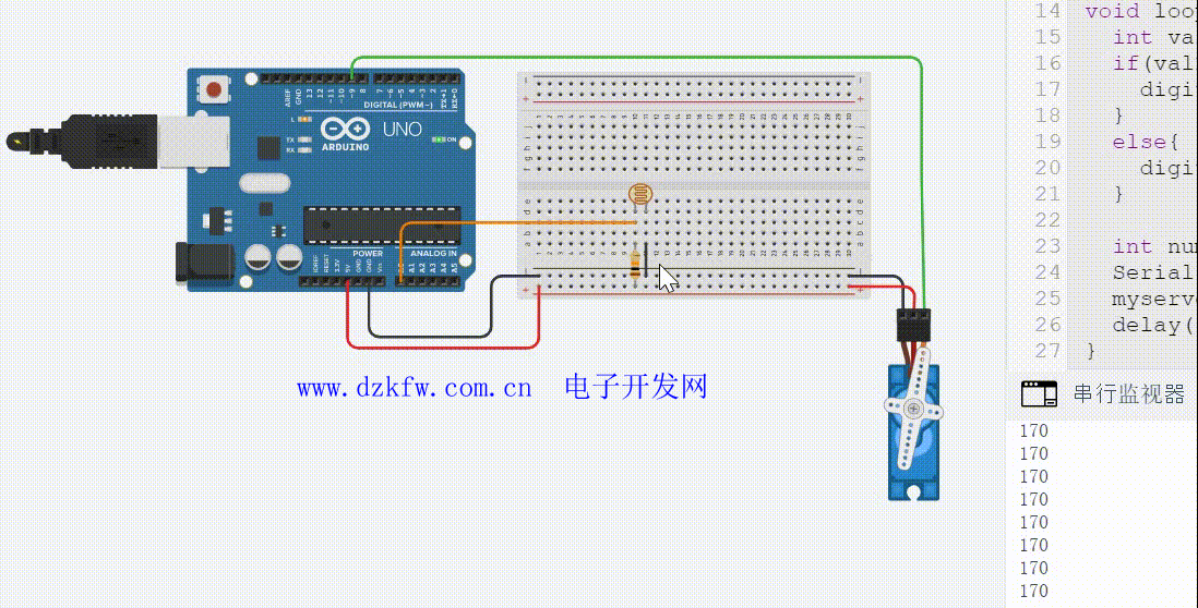實現(xiàn)功能:隨著光照強(qiáng)度增加,舵機(jī)跟著轉(zhuǎn)動。A0產(chǎn)生的模擬值大于500時,內(nèi)置的13引腳的可編程LED發(fā)光。