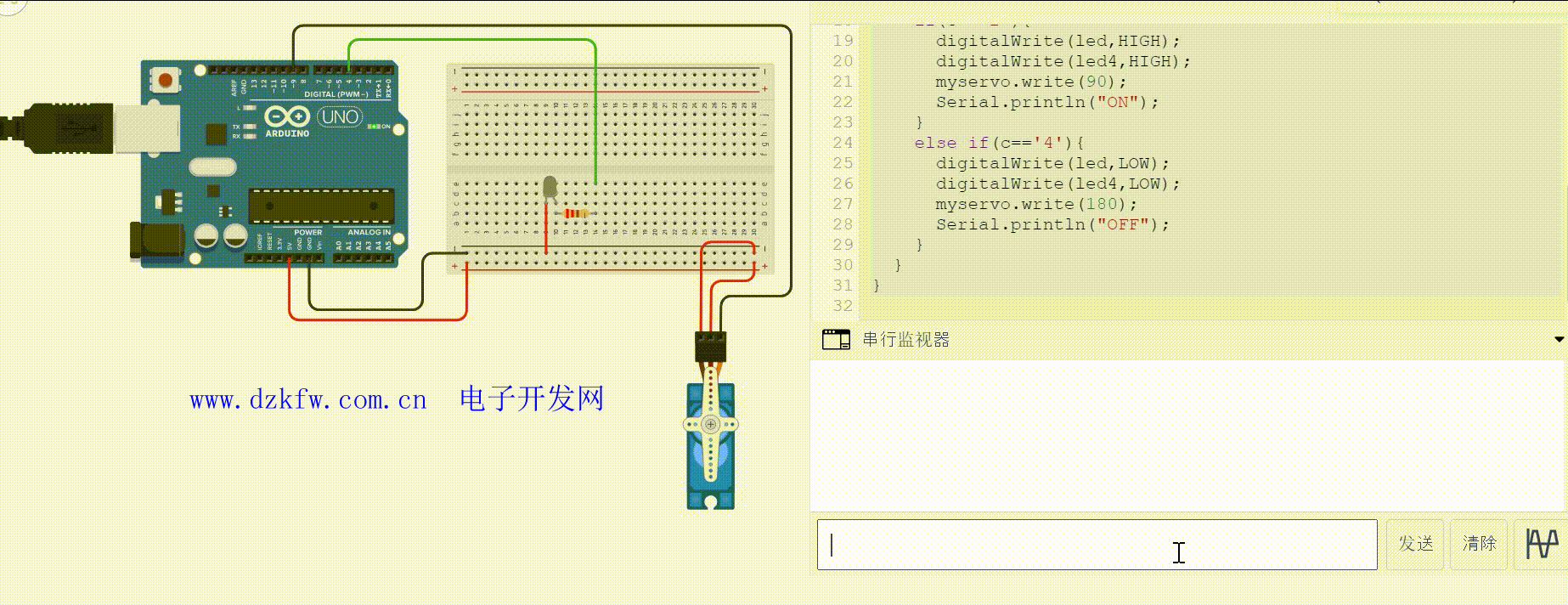 串口輸入4,led熄滅,同時串口打印“OFF”,舵機(jī)轉(zhuǎn)動到180°