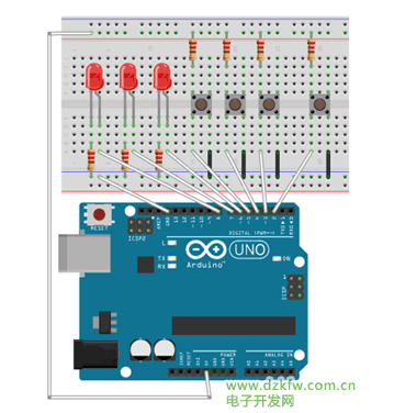 使用Arduino編程,使得按下按鈕對(duì)應(yīng)的LED燈會(huì)亮起,按下結(jié)束所有LED燈熄滅。