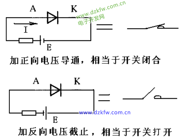 二極管是單向導電器件,加正向電壓,導通,相當開關閉合;加反向電壓,截止,相當于開關斷開